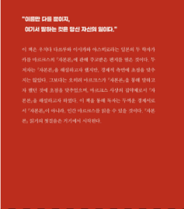 “자본주의의 윤리적 붕괴와 인간 존재의 위기”라는 문제의식은 매우 선명하게 드러난다. 두 저자는 오늘날 금융화된 자본주의가 노동자의 경제적 생존을 위협할 뿐 아니라, 인간이 인간으로 존재하기 위한 최소 조건마저 해체하고 있다고 지적한다. 불안정 노동과 자산시장 중심의 경제는 삶의 기반을 불확실성 속으로 몰아넣으며, 구조적 모순을 넘어 윤리의 해체로 이어진다. 경쟁과 효율의 논리는 인간을 타자와 연결된 윤리적 존재가 아니라, 고립된 개체적 주체로 재구조화하고 있다. 이 서적이 제기하는 문제는 결국 하나다. 자본주의는 어디까지 인간을 파괴할 것인가? 그리고 우리는 무엇을 기준으로 ‘살아남을 수’ 있는가?